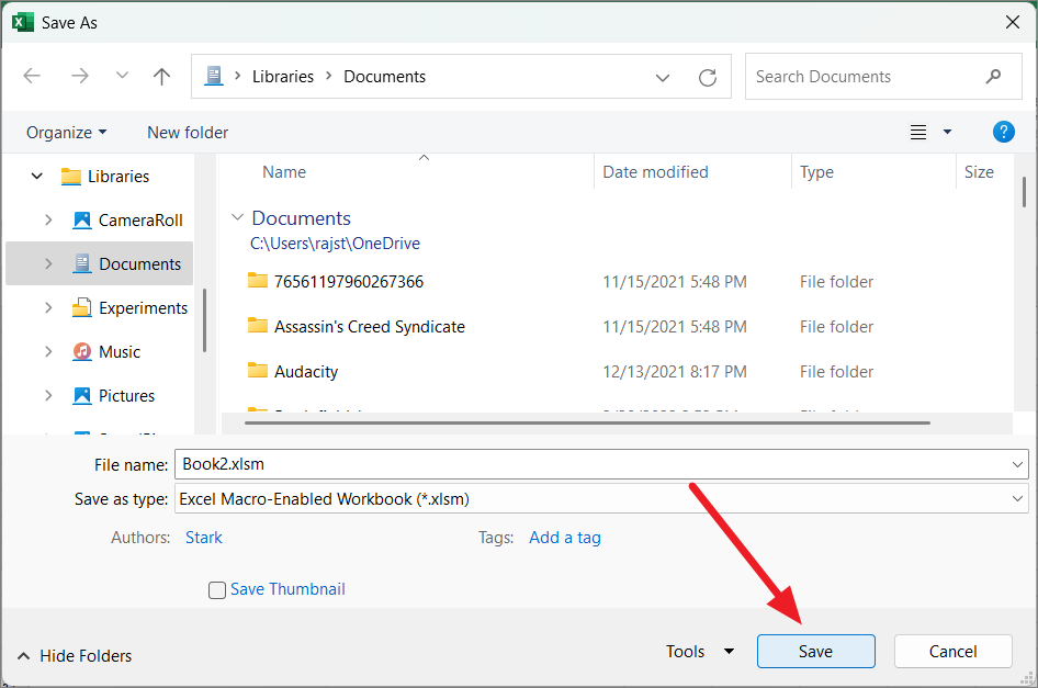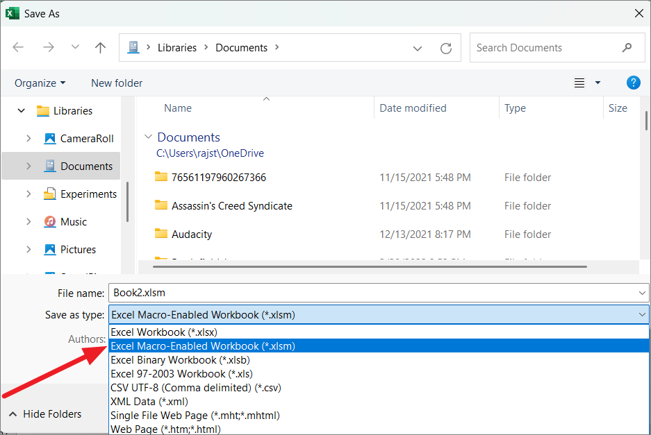 In the Save As window, choose the ‘Excel Macro-Enabled Workbook (*.xlsm)’ format from the ‘Save As type’ drop-down.