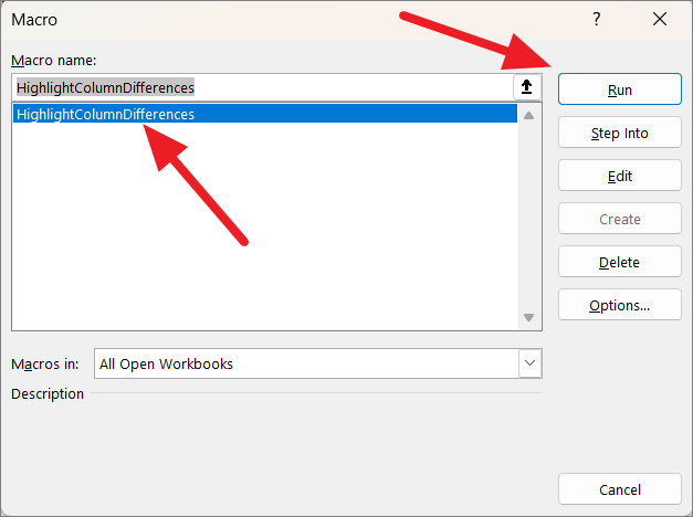A dialog box named Macro will open up. Under the Macro name, you will see the macro you created. Select the ‘HighlightColumnDifference’ macro and click ‘Run’.