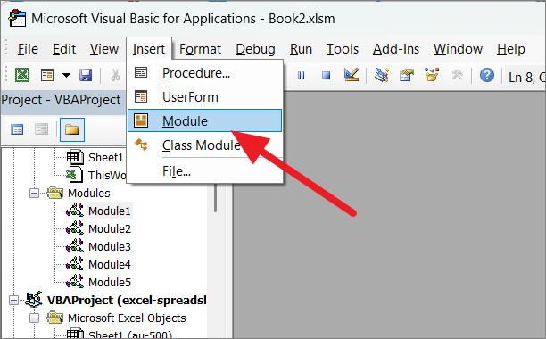 Open the spreadsheet and press Alt+F11 to open the Microsoft Visual Basic for Applications window. Then, go to ‘Insert’ > ‘Module’ in the Microsoft Visual Basic for Applications window.