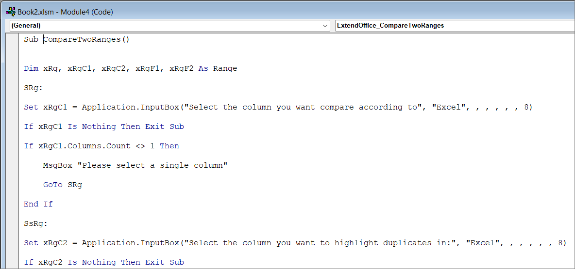 Set xRgC2 = Application.InputBox("Select the column you want to highlight duplicates in:", "Excel", , , , , , 8)