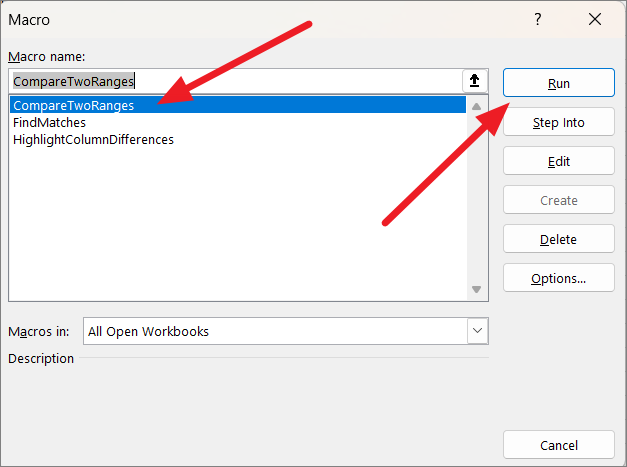 In the Macro dialog window, select ‘CompareTwoRanges’ and click ‘Run’.