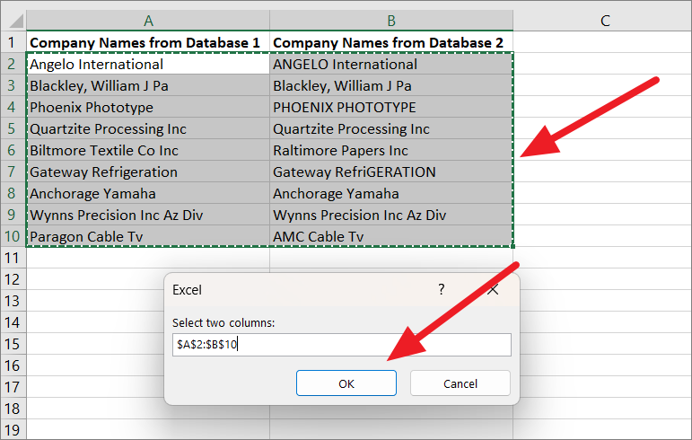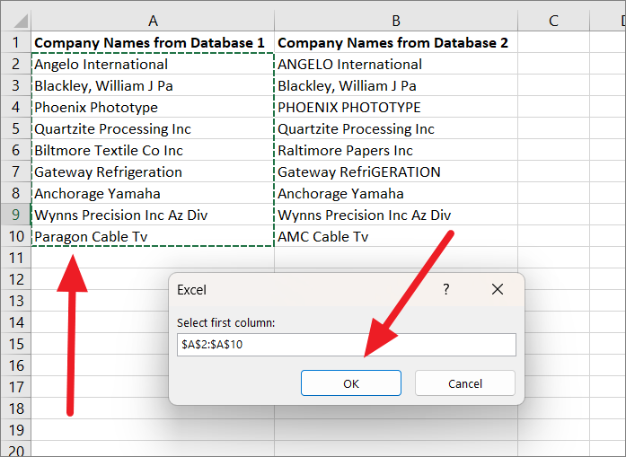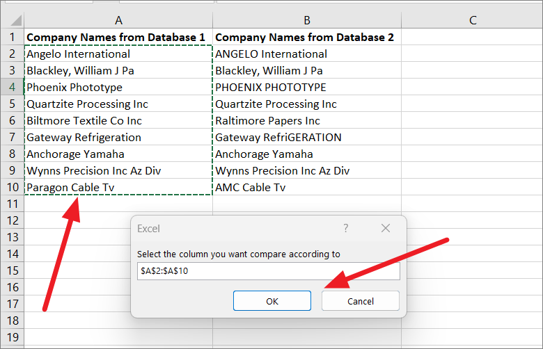 Now, you will see a dialog box for specifying the two columns. Simply select the columns you want to compare and click ‘OK’.