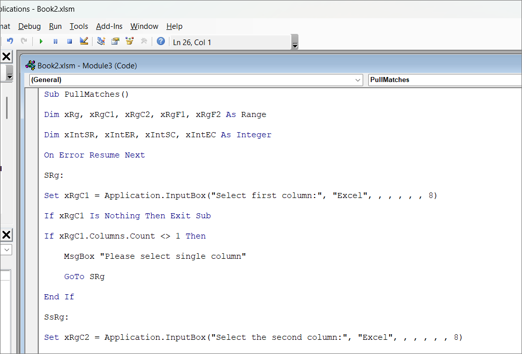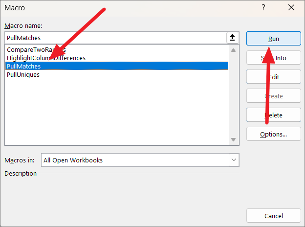 After pasting the code save the file and close the Microsoft Visual Basic for Applications window. Then, open the Marco dialog window, select the ‘PullMatches’ macro and click ‘Run’.