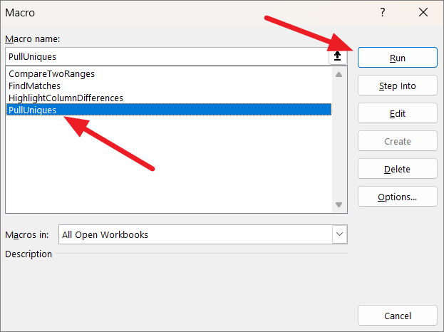 After that, open the Marco dialog window, select the ‘PullUniques’ macro, and click ‘Run’.