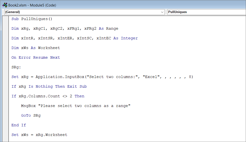 Set Rg = Application.InputBox("Select Two Columns:", "Excel", , , , , , 8)