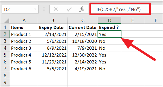 To find out if the products are expired or not, compare two columns if column C is greater than column B: