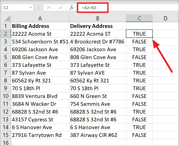 =A2=B2The formula looks for the correct match between the two columns and will not miss even a single space character. Then it returns TRUE if the condition is met or else returns FALSE. The billing address in cell A2 matches the delivery address in cell B2, as a result, we get TRUE. Also, the address in cell A5 does not match the address in cell B5 – the last character is different in cell B5. Hence, it returns FALSE.