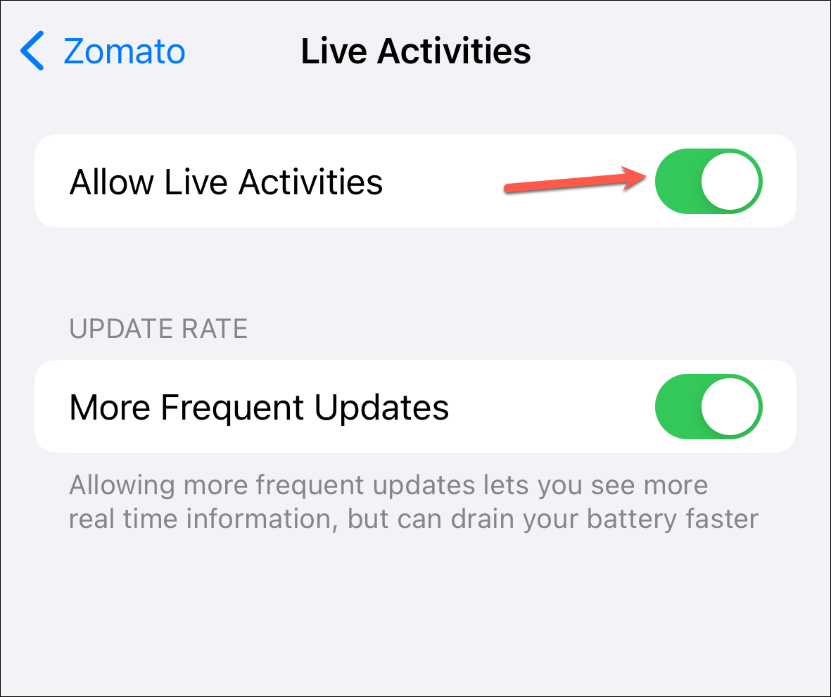 Alternatively, you can turn off Live Activities on an app-by-app basis. So, while you might want to keep them enabled for your Cab booking apps, you might want to disable them for Sports Scores when you want to extend battery life. You can turn off Live Activities for an app by navigating to Settings > App Name > Live Activities and turning off the toggle for 'Allow Live Activities'.