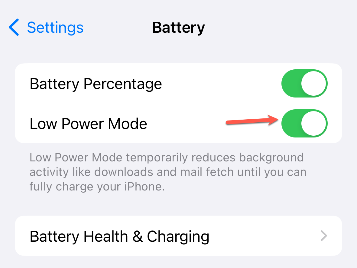 Settings>Batteryand enable the toggle for 'Low Power Mode'.