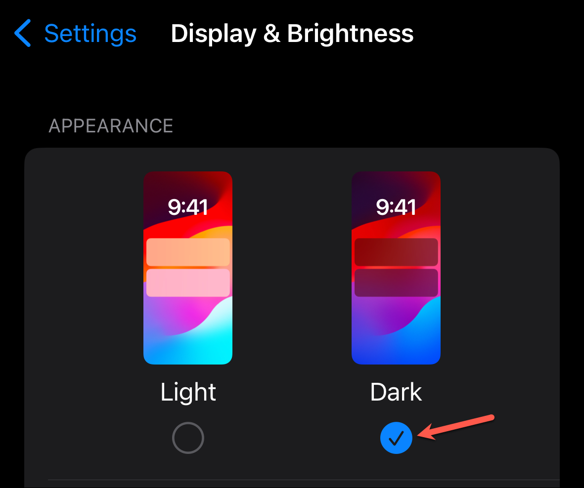 Settings>Display & Brightnessand select 'Dark ' under 'Appearance'.