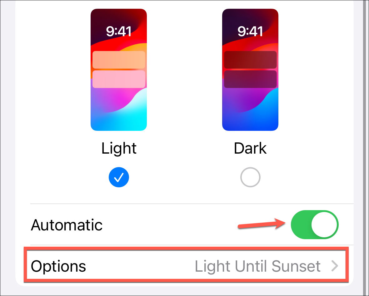 - You can also schedule Dark Mode for particular hours by enabling the toggle for 'Automatic' and setting a schedule from 'Options'.