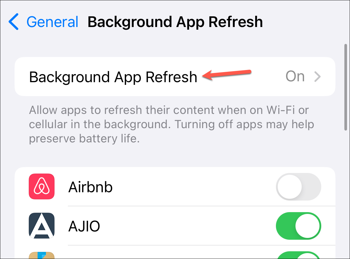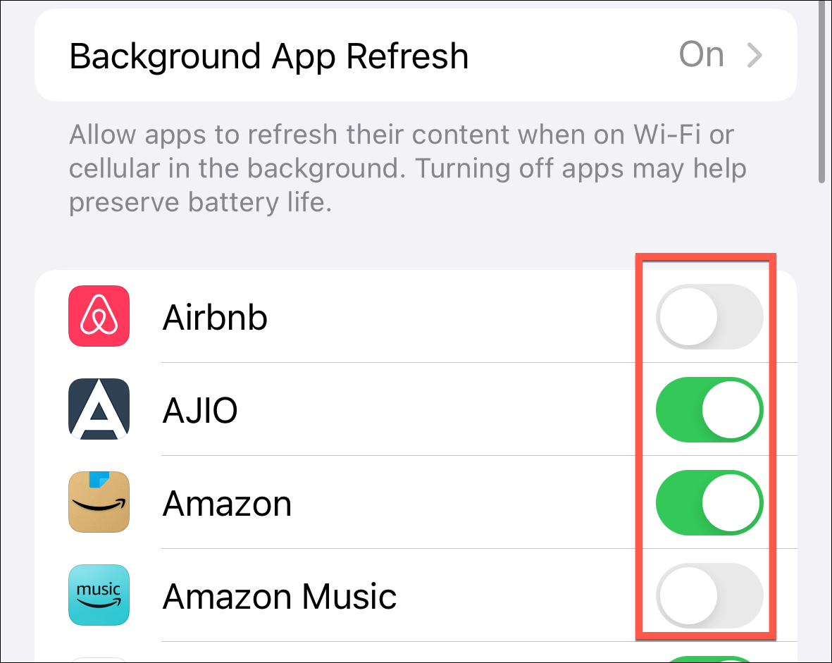 - Here, you can review the apps that you want to be able to refresh the content in the background and turn off the toggle for others.