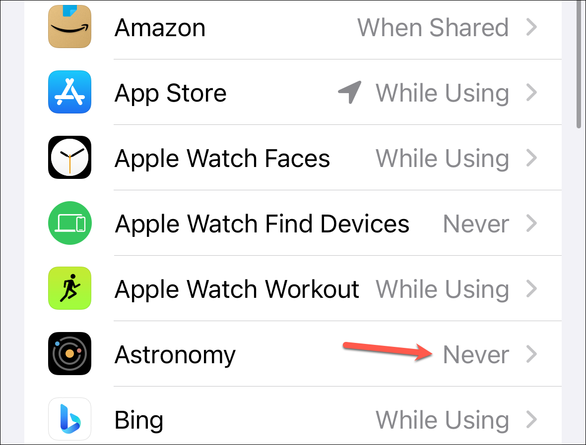 - Here you can review the apps that are using Location Services and choose 'Never' to disable location access for particular apps.