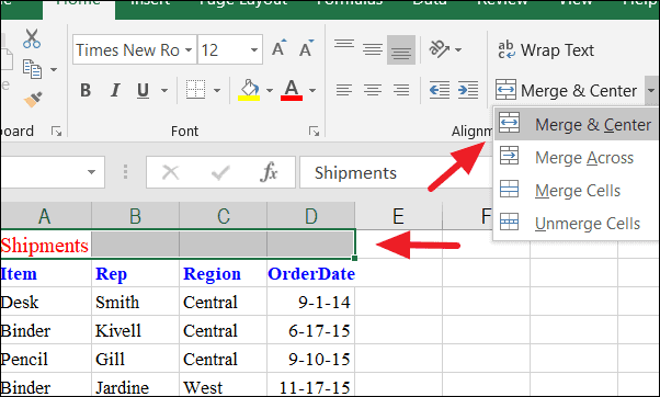Step 2: Go to the Home tab, click on the Merge & Center dropdown, and select Merge & Center.
