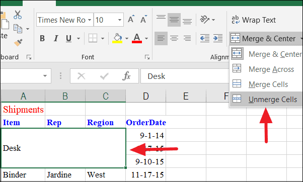 Step 2: Click on the Merge & Center dropdown in the Home tab and choose Unmerge Cells.