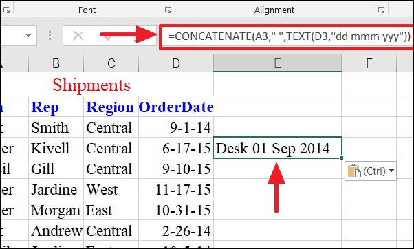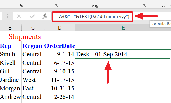 =CONCAT(A3," ",TEXT(D3,"dd mmm yyyy"))