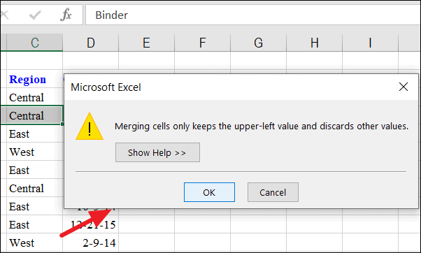 Note: When using this feature, only the data in the upper-left cell is retained. Excel will warn you if data from other cells will be lost.