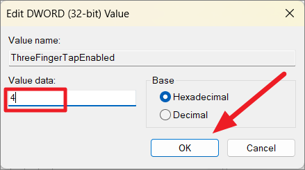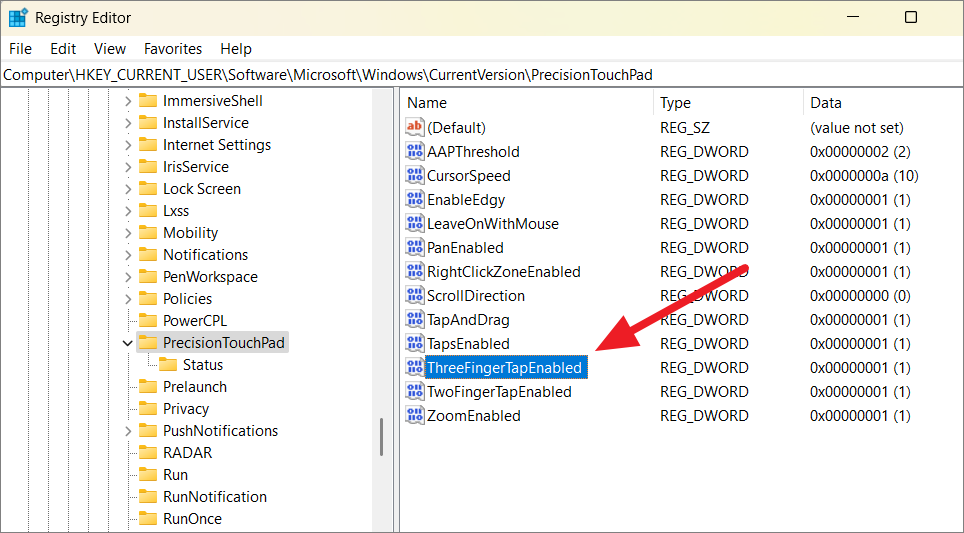 - In the right pane, double-click on the ThreeFingerTapEnabled DWORD to edit it.