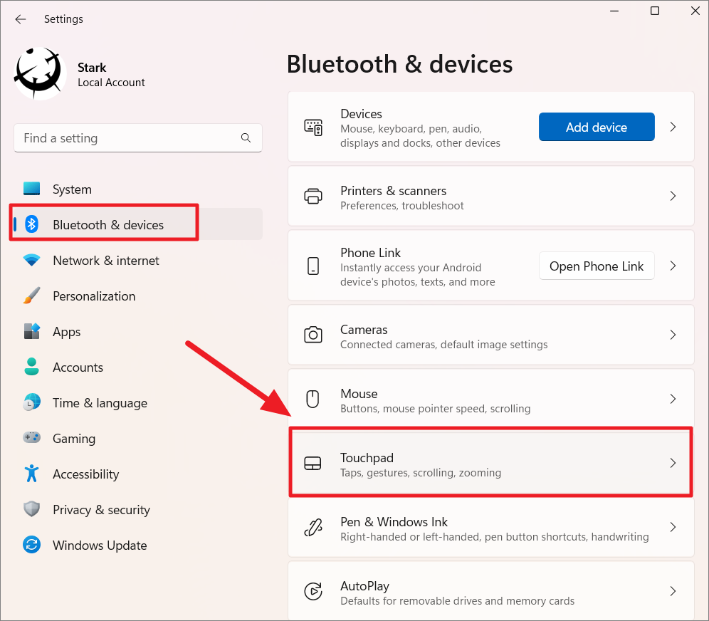 Windows+I. - In the Settings window, select Bluetooth & devices from the left sidebar, then click on the Touchpad tile on the right.