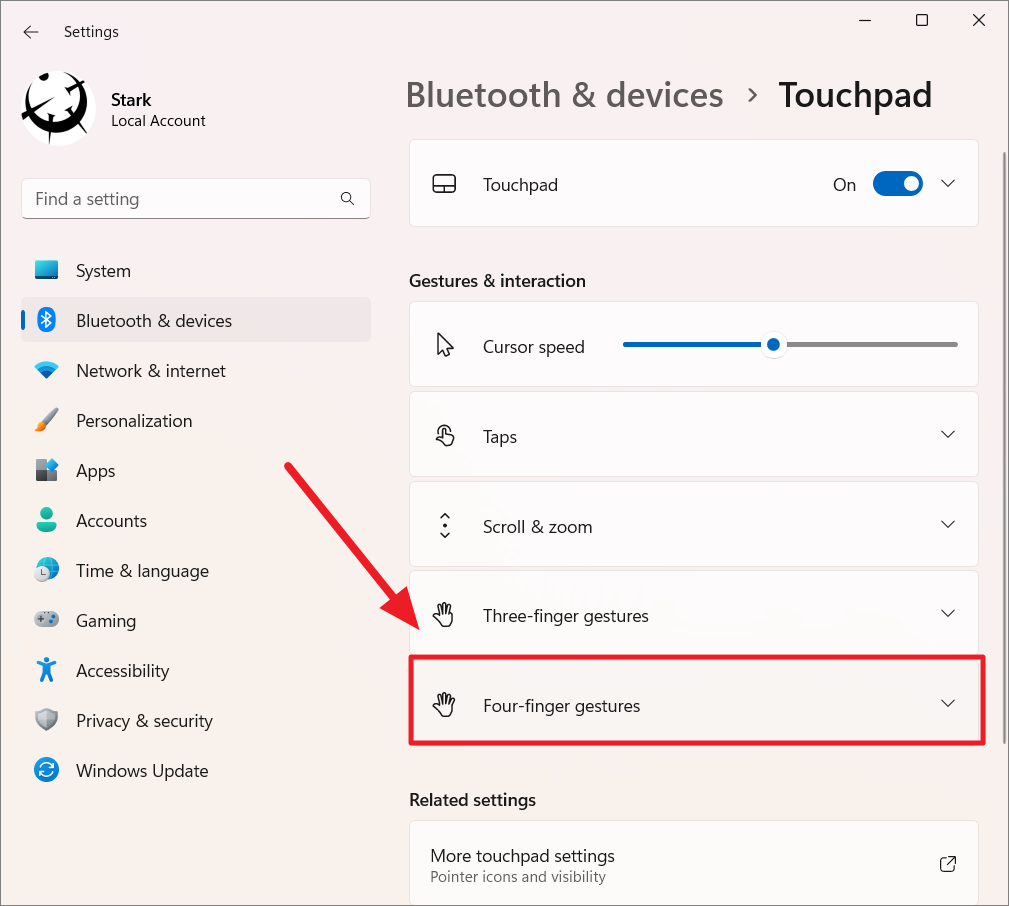 - In the Touchpad settings, click on Four-finger gestures to expand the options.