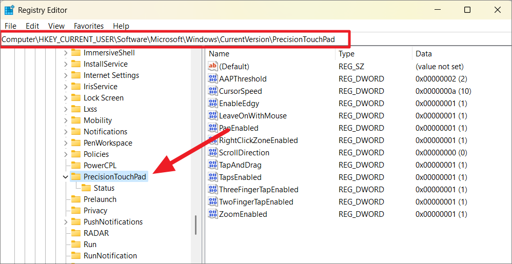 Computer\HKEY_CURRENT_USER\Software\Microsoft\Windows\CurrentVersion\PrecisionTouchPad
