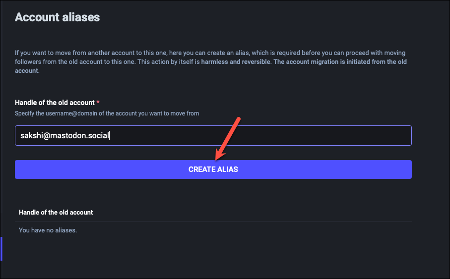 Now, enter the handle of the old account in the field provided. Remember to enter the complete handle, i.e., username@domain. For example, if your old username is abc on the Mastodon Social server, enter abc@mastodon.social in the field. Then, click ‘Create Alias’.