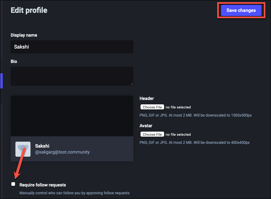 Now, uncheck the option for ‘Require follow requests’ if it is checked and click ‘Save Changes’.