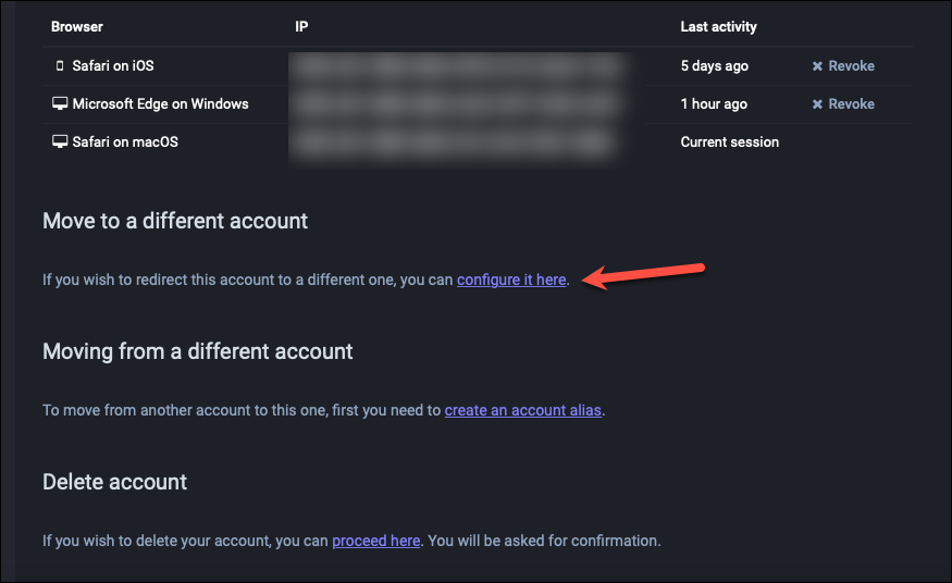 Scroll down and click the option for ‘Configure it here’ under the ‘Move to a different account’ section.
