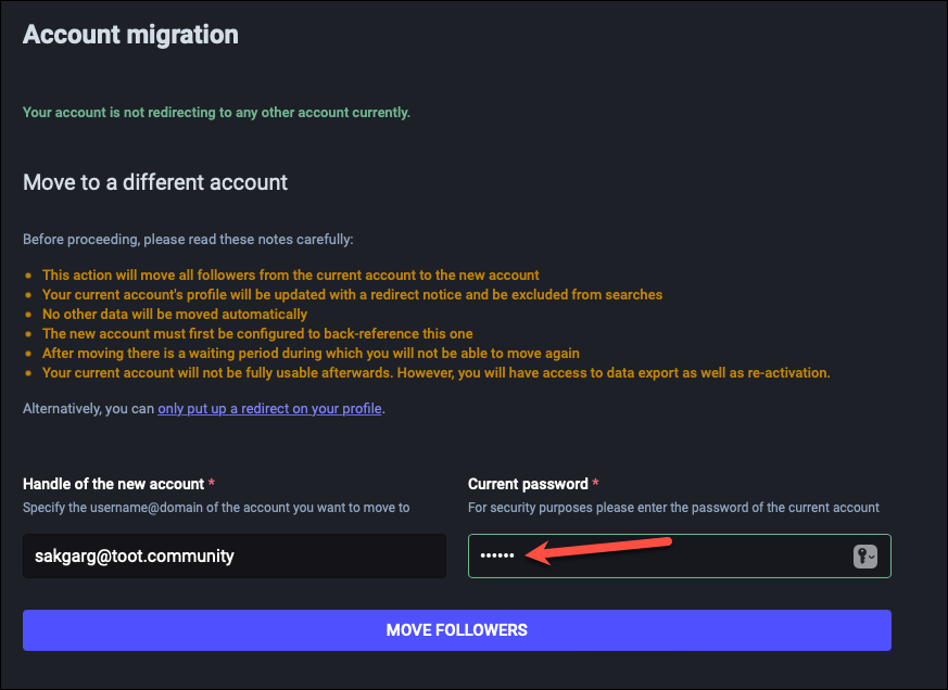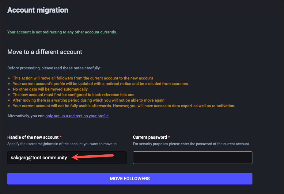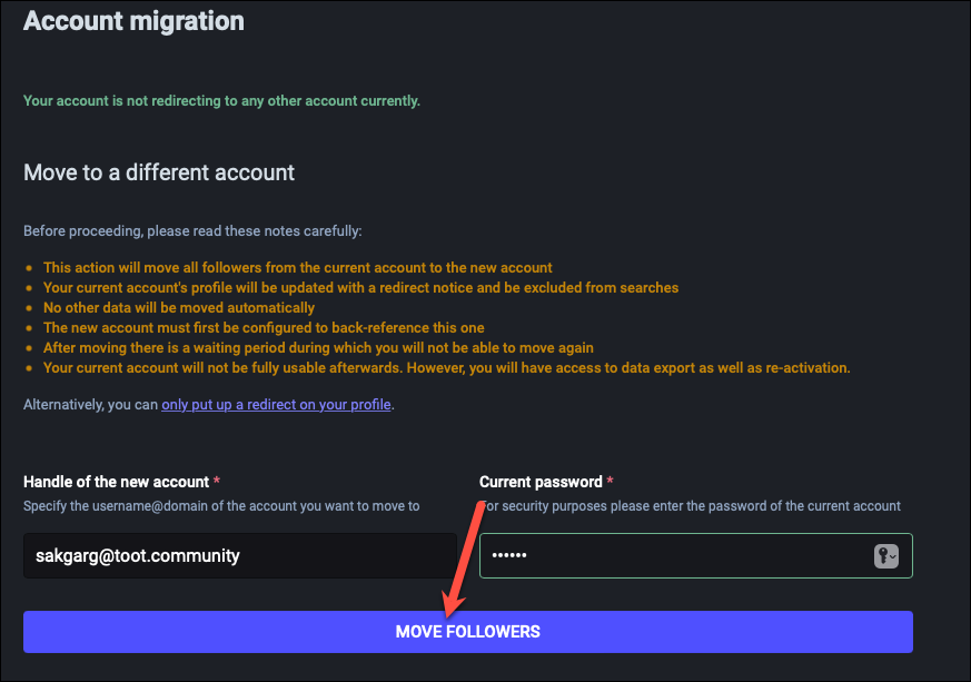 - All followers from your current account will be moved to your new account. This step is irreversible, i.e., once they’re forced to unfollow your current account and made to follow the new account, you cannot get them back at the old account without migrating servers again. And you can only migrate servers again after the cooldown period is over. No other data will be moved automatically, though. You’ll have to move it yourself, which we’ll see in the next step.