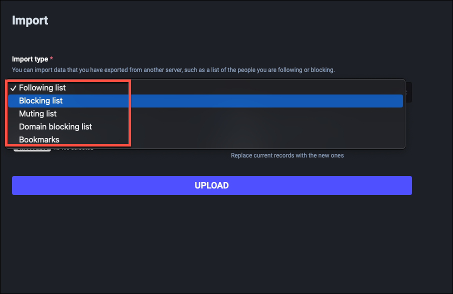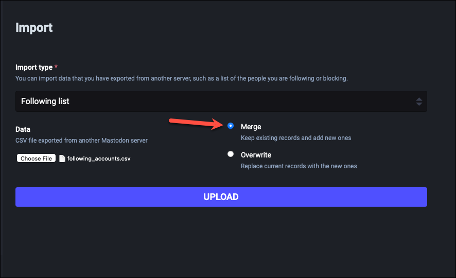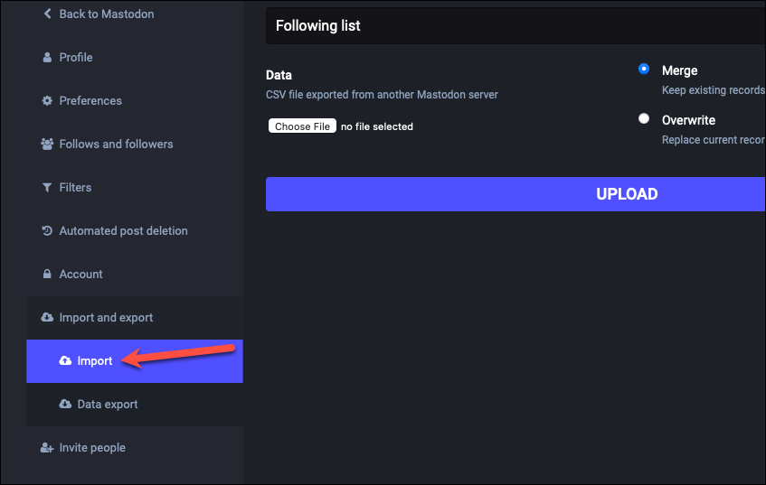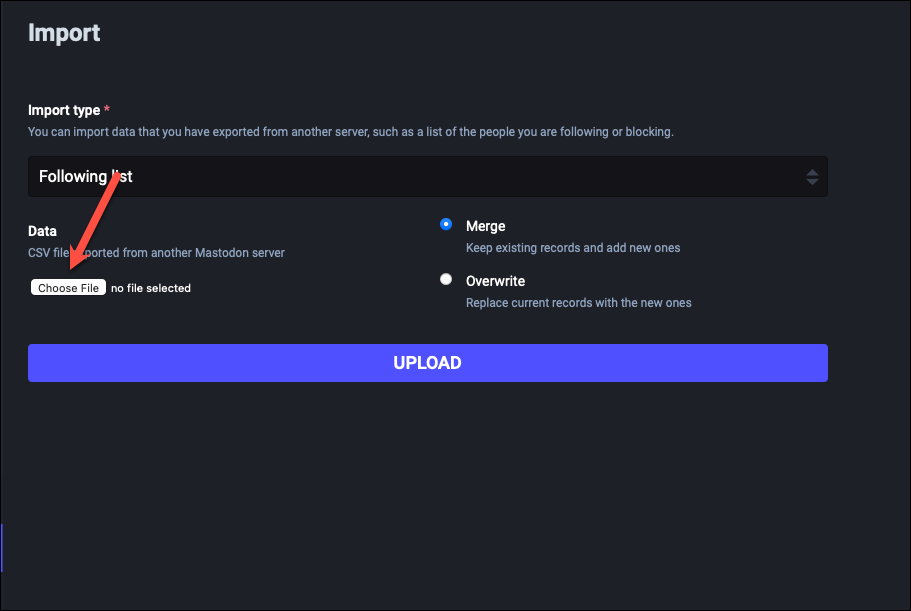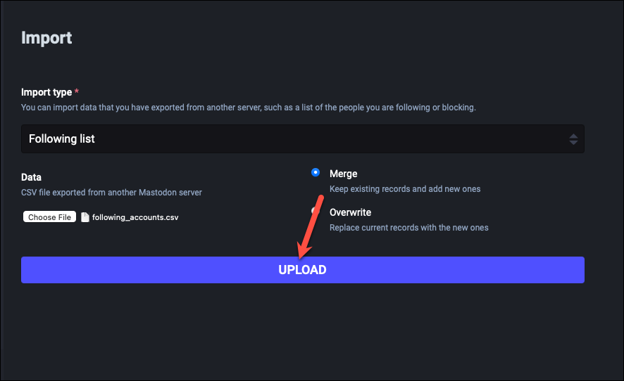 While Mastodon’s account migration option automatically moves your followers when you move accounts, your other data like followings, mute lists, block lists, bookmarks, domain blocks, etc. are not moved. But if you export CSV files for this data for your account, you can import them to your new account. If you don’t want to import this data to your new account, you can skip this step.