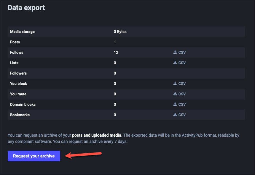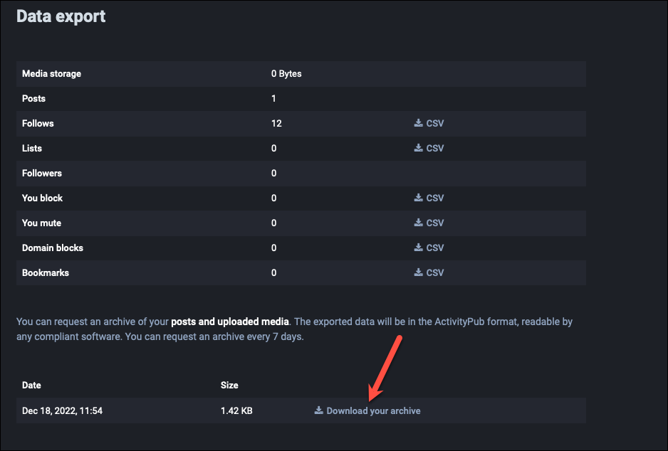 And that’s it. An archive of your data will be downloaded on your computer in a CSV file format that’s readable by any ActivityPub software, not just Mastodon.