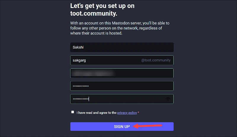Check the privacy policy checkbox and click the ‘Sign Up’ button.