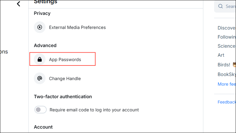 - Once the extension is installed, you will need to create a password that is specific to that app for your Bluesky profile. Sign in to your Bluesky account using a web browser and click on 'Settings' on the left.