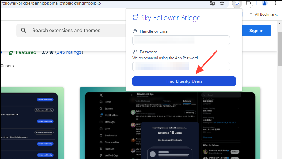 - When the extension appears, type in your Bluesky email and the App password you created earlier. Then click on the 'Find Bluesky Users' button.