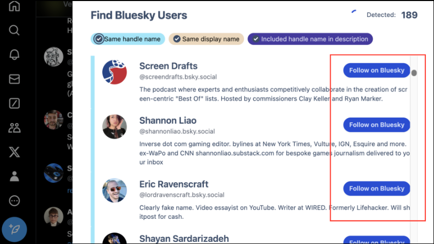 - Then click on the 'Follow' button for the users you want to follow on Bluesky. You can also click on the 'Follow all' button if you want to follow all the users the extension detects. You can also block the users you've blocked on X in the same way.