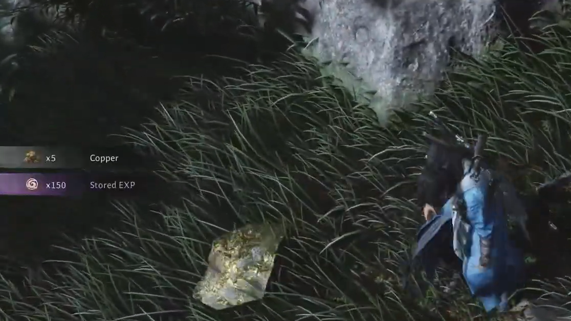 Ore nodes in the open world are treated as environmental objects you break with martial arts moves. There is no mining pick in your inventory; instead, you crack the rock by combining a jump with a ground‑slam ability.