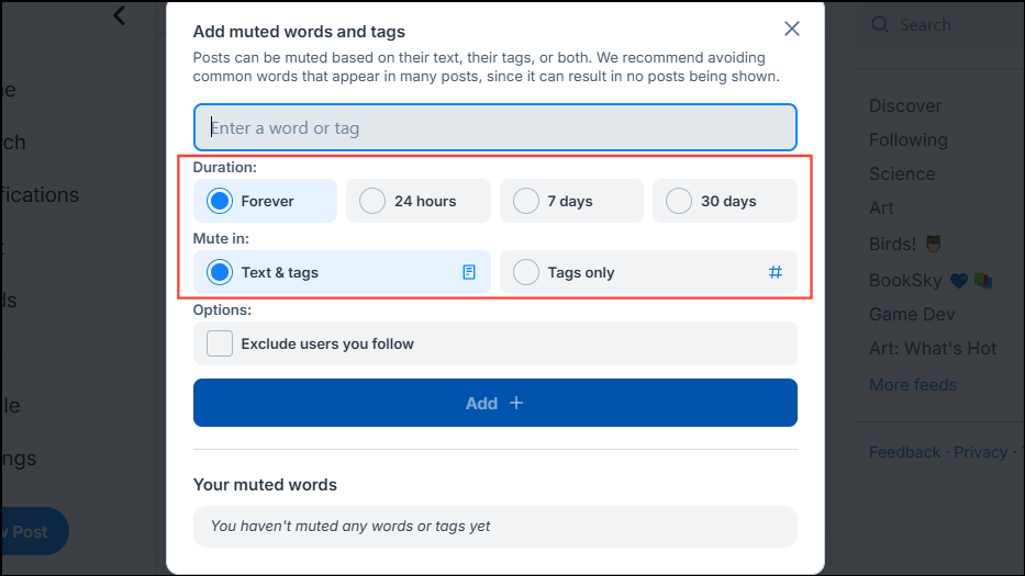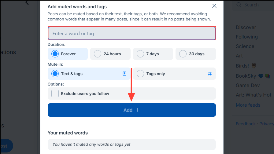 - Now you can type in the words and tags you don't want to see in the text box and click on the 'Add +' button. This will prevent them from appearing in your feeds.