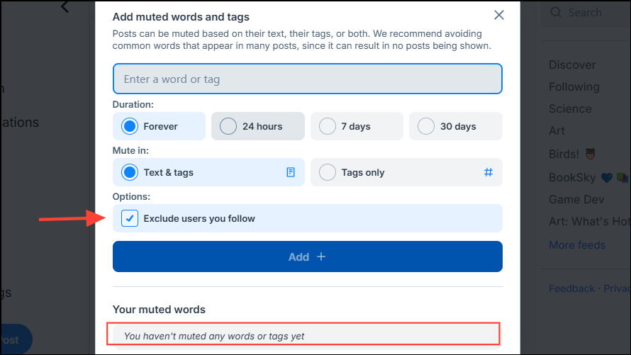 - If you want to exclude users you follow from your list of muted words and tags, click on the 'Exclude users you follow' checkbox. At the bottom of the box, you can see all the words and tags you've muted.