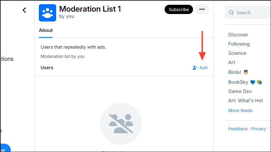 - Then click on 'Add' and type in the name of the user you want to add to the list. This will prevent posts from users you've added to the list from showing up.