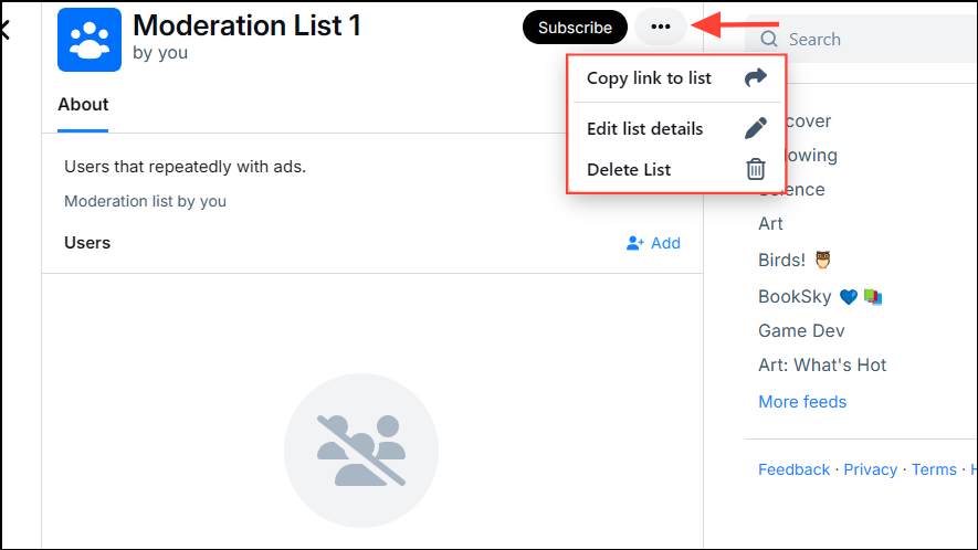 - You can edit a list you create here by clicking on the three dots on the top right. This will show you the option to copy its link to another list, edit the list details, or delete the list.
