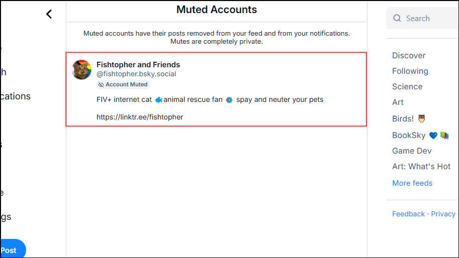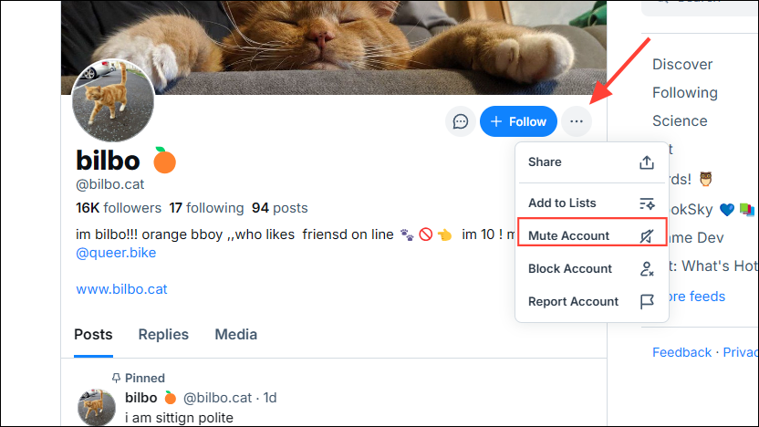 Another way of moderating your Bluesky feeds is to mute accounts. When you mute an account, Bluesky will not show you any notifications when that user creates a post, makes a comment, or performs any other action on the platform.