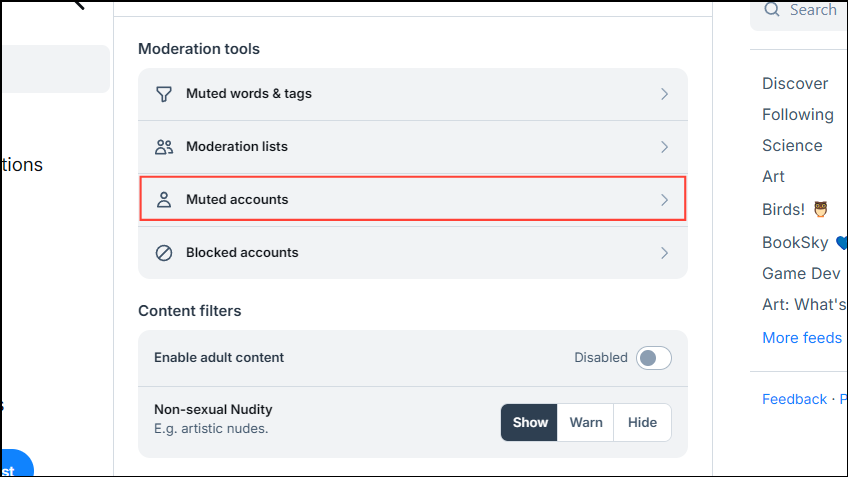 - Once you've muted a user, go to the Moderation section in Bluesky settings and click on 'Muted accounts'.