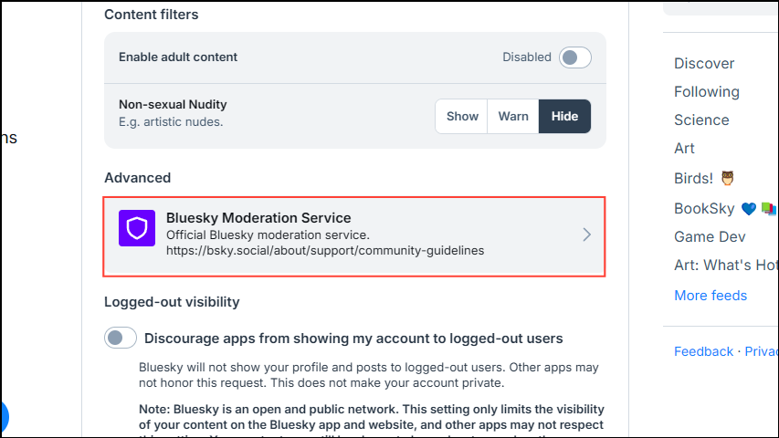 - If you want more advanced moderation controls, click on 'Bluesky Moderation Service' on the Moderation settings page.