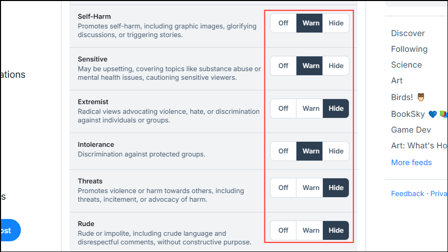 - Now you can control the visibility for different types of categories like Self-Harm, Sensitive, Extremist, Intolerance, etc. Click on the 'Off', 'Warn', or 'Hide' buttons for each option as per your preference.