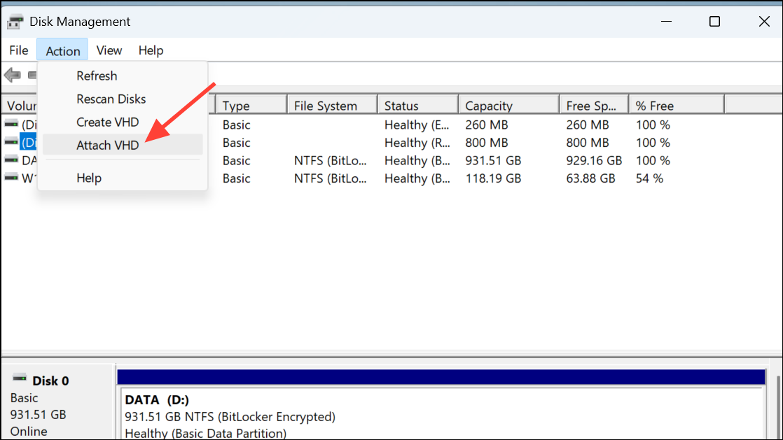 Step 2: In Disk Management, click on "Action" from the top menu and select "Attach VHD".