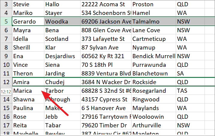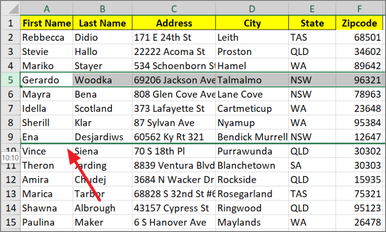 Step 3: Click and hold the left mouse button, then drag the row to the new location. A bold green line indicates where the row will be inserted. For instance, moving row 5 between rows 9 and 10.