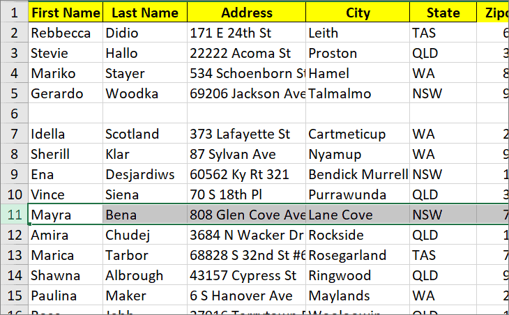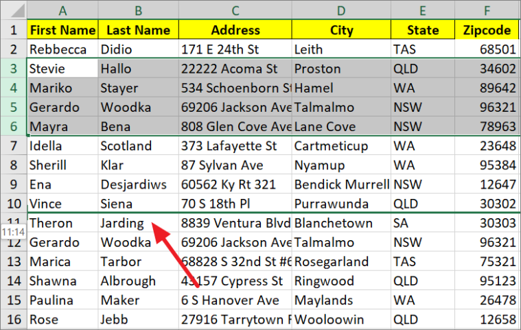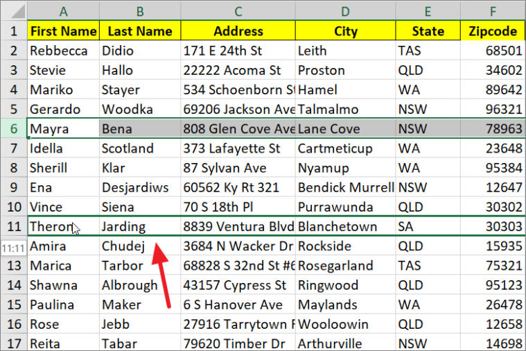 Step 3: Click and hold the left mouse button, then drag the row to the desired location. As you drag, a green border will highlight the destination row. For instance, dragging row 6 down to row 11.