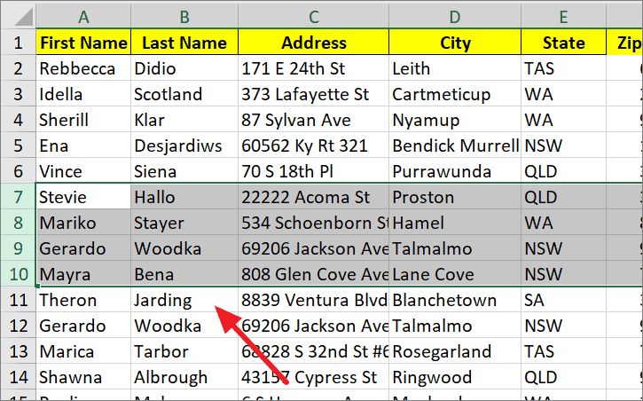 Step 2: Use the drag-and-drop method, with or without the Shift or Ctrl keys, to move the selected rows to a new location. In this example, hold the Shift key to move the rows without overwriting data.