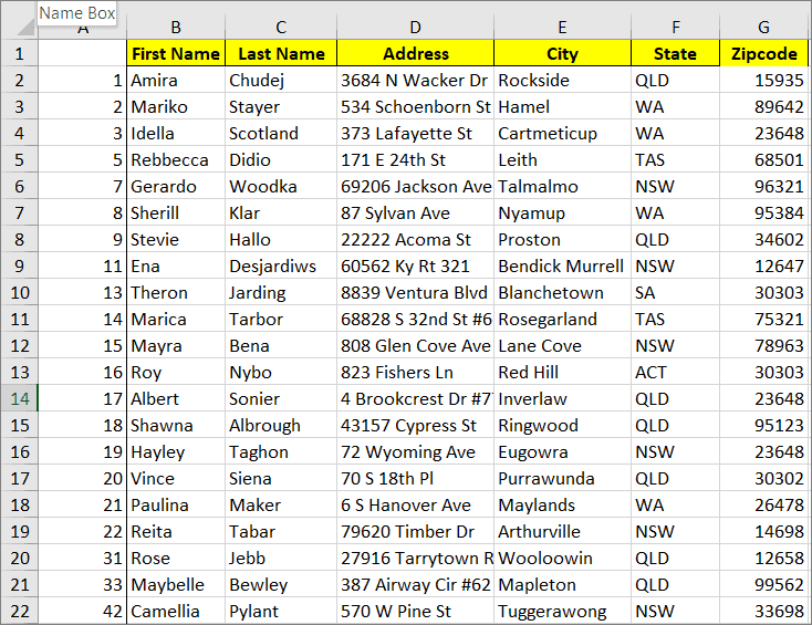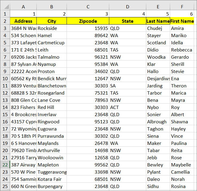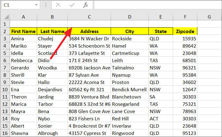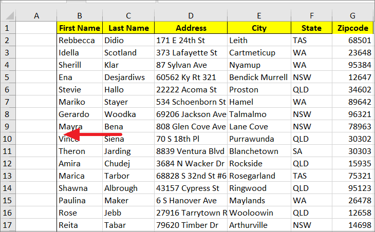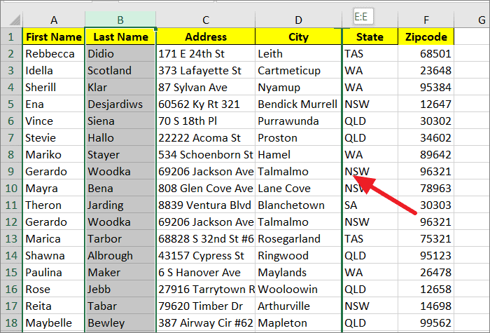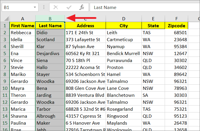 Step 1: Select the column you want to move by clicking on the column header. For example, to move column B (Last Name) after column D (City), select column B.