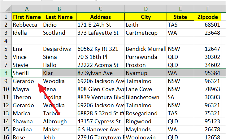 Step 3: Select the destination row where you want to move the data. Click on the row number to select the entire row.